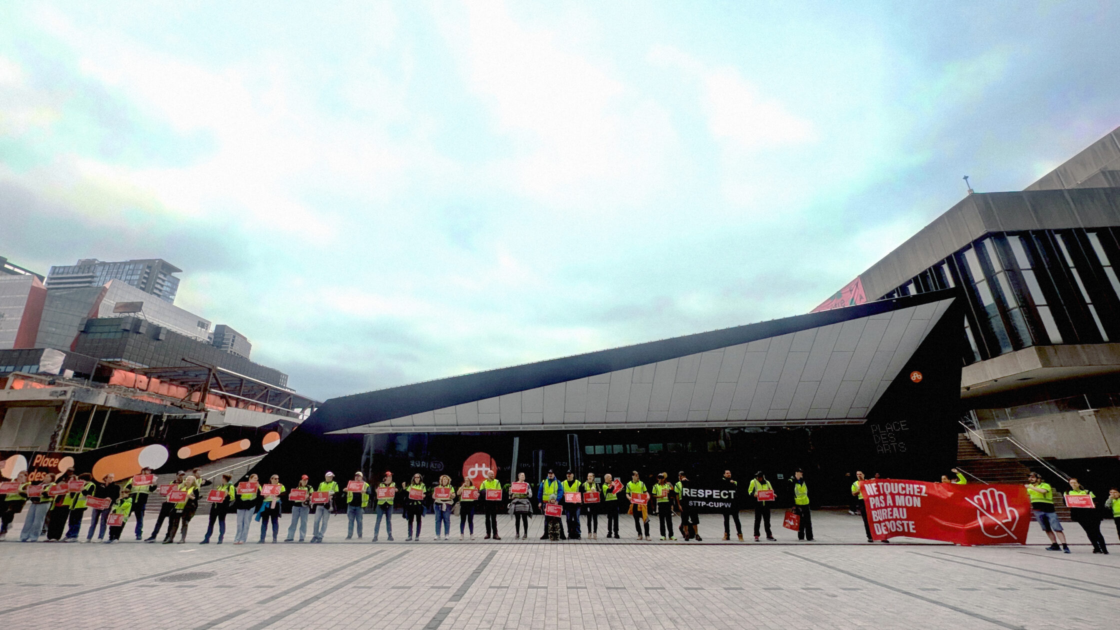 Earlier today, postal workers held a surprise action at Montreal‘s Complexe Desjardins, gathering for about 30 minutes. At noon, more than fifty postal workers appeared in the middle of the busy shopping center. Facing them from the upper level, François Kirsch, equipped with a microphone and sound system, had a message for passersby.
