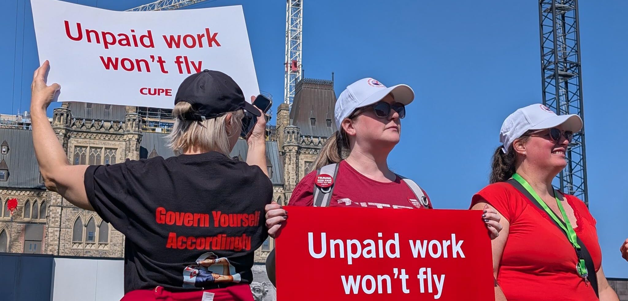 “Unpaid work is not over and we are not going to rest until it is,” Wesley Lesosky, president of the CUPE Air Transport Branch, told more than 150 people yesterday. Air Canada flight attendants gathered on Parliament Hill in Ottawa to denounce the government's inaction in the face of their thousands of unpaid hours each year.